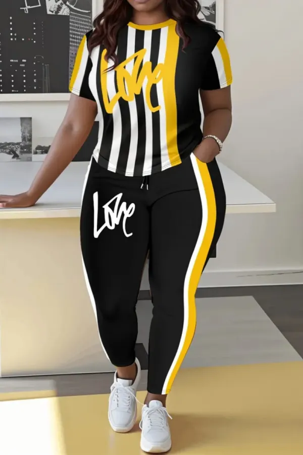 Turn heads in this bold and confident two-piece sweat set made to flatter every curve. Featuring a vibrant stripe design with eye-catching “Love” print detail, this set pairs a comfy O-neck short sleeve top with high-waisted skinny sweatpants. The stretchy, breathable polyester blend and elastic waist make it perfect for casual days, errands, or laid-back weekends. Whether you’re lounging or making moves, this set delivers sporty style with a side of self-love.