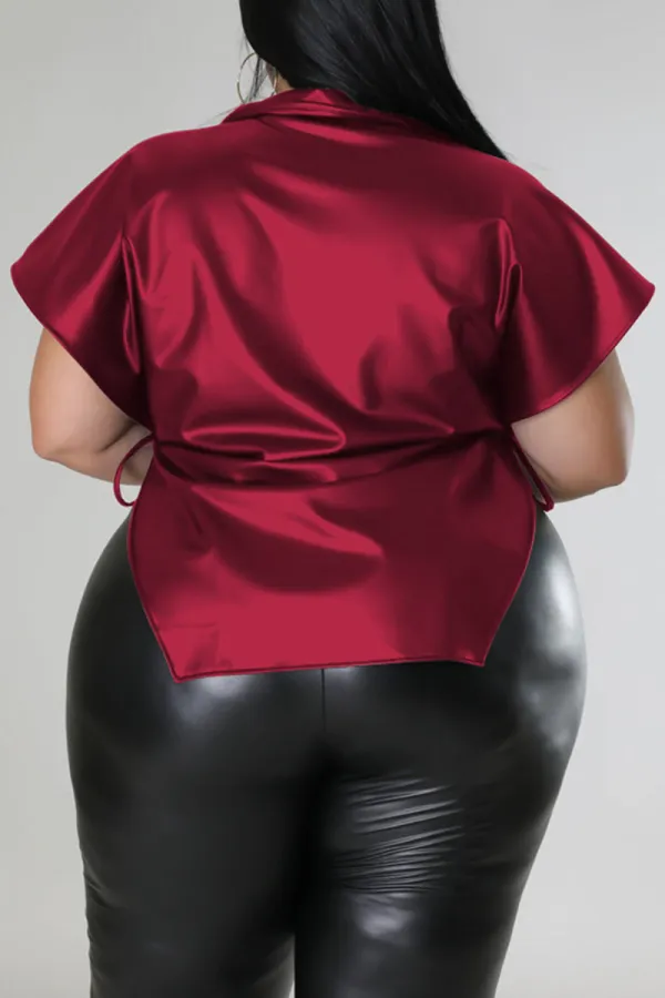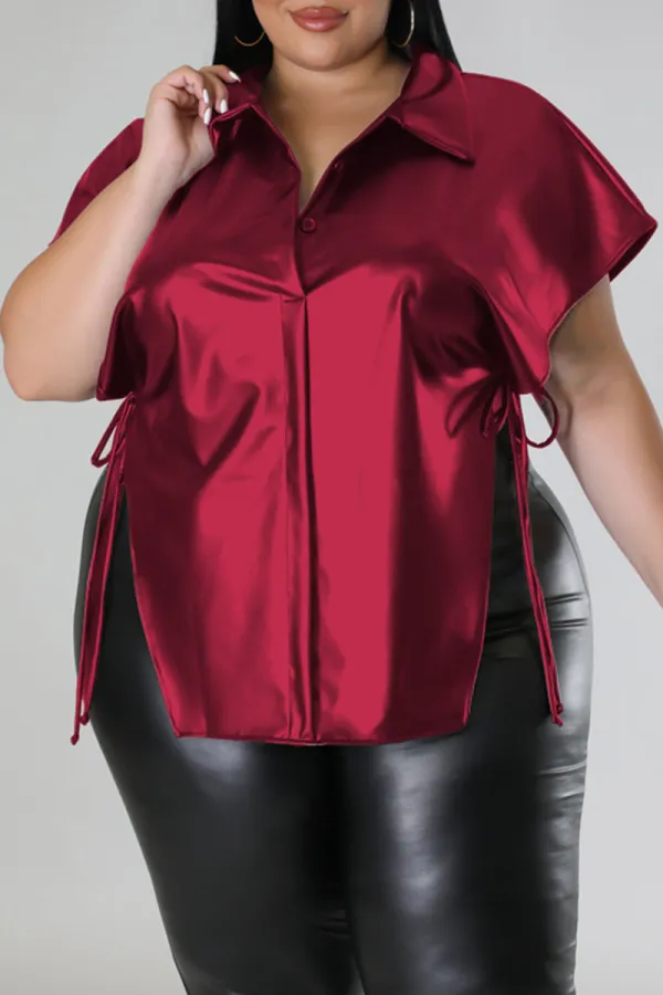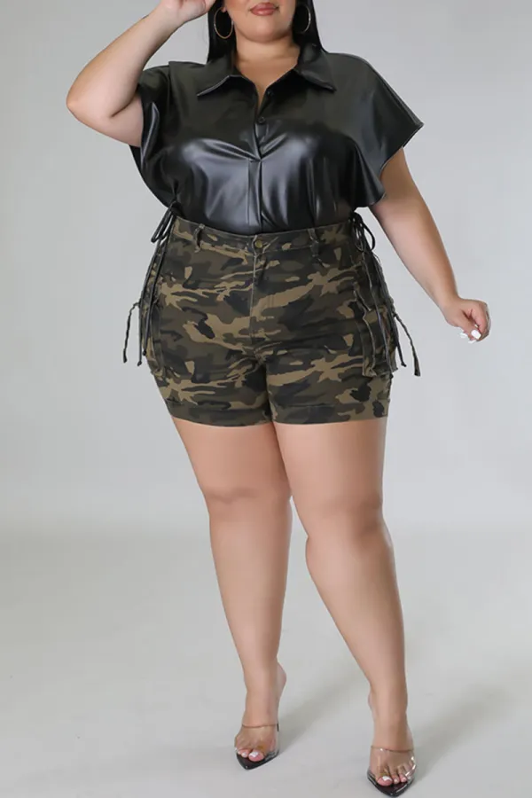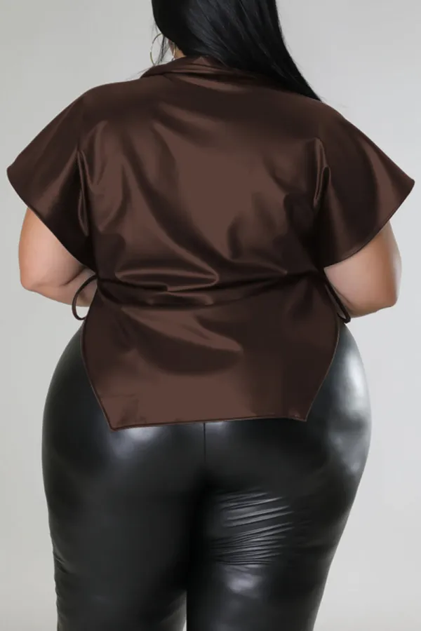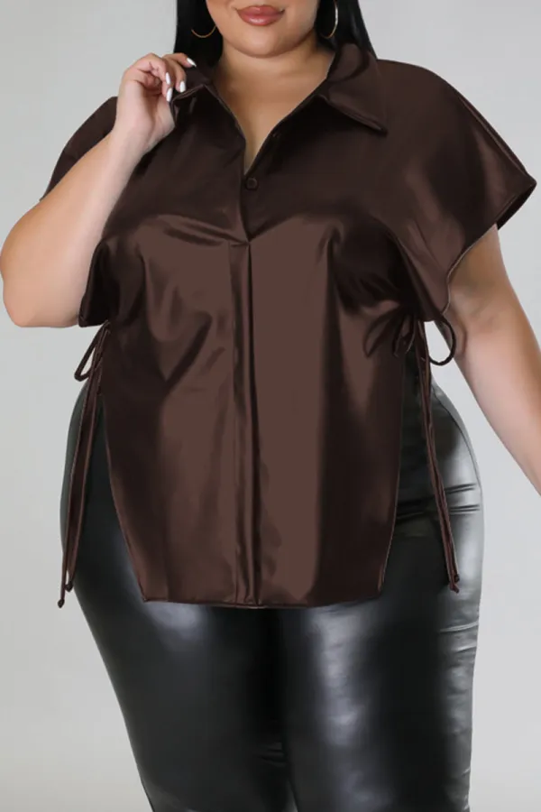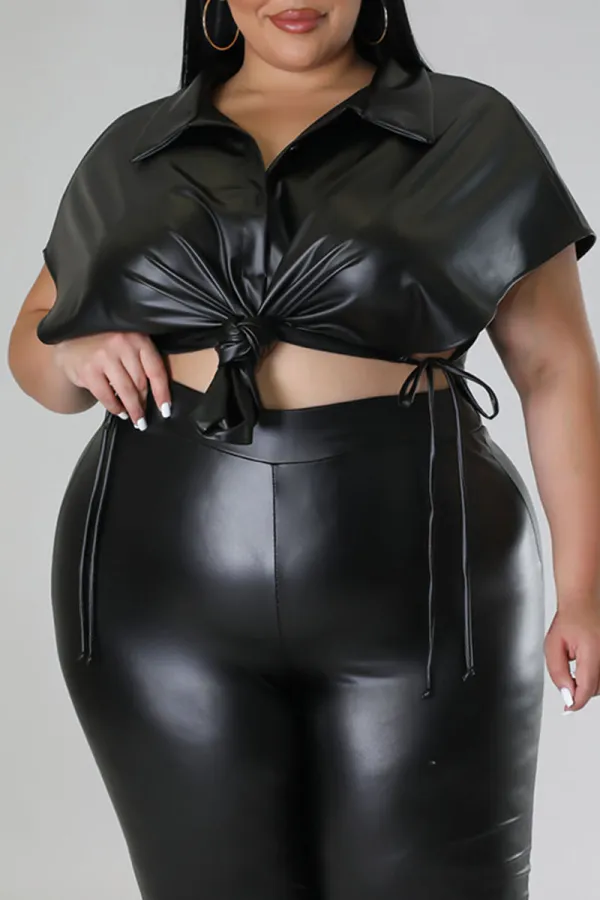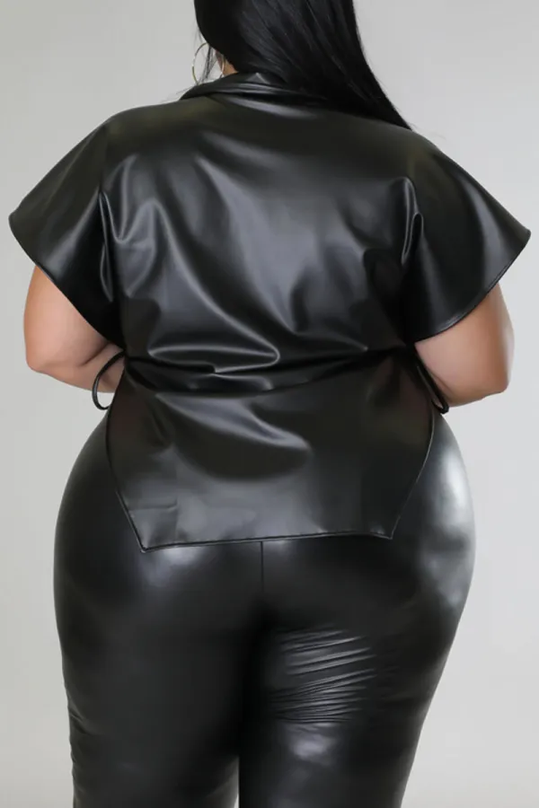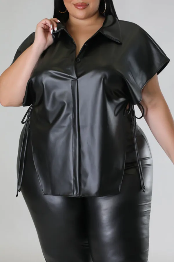 Step into street-chic confidence with the Edgy Elegance Black Plus Size Top. Crafted from a blend of polyester and PU for that sleek, structured look, this bold piece features eye-catching bandage-style detailing, faux leather patchwork, and a statement side slit that elevates your silhouette. The turndown collar and dropped shoulder sleeves offer a laid-back yet polished vibe, making it perfect for pairing with everything from jeans to faux leather pants.