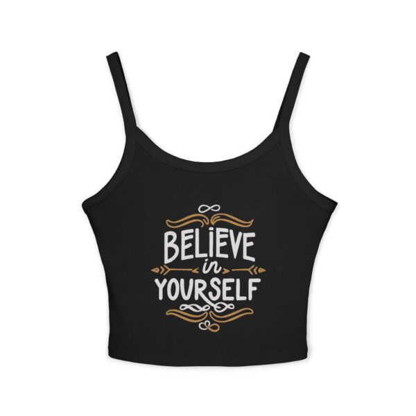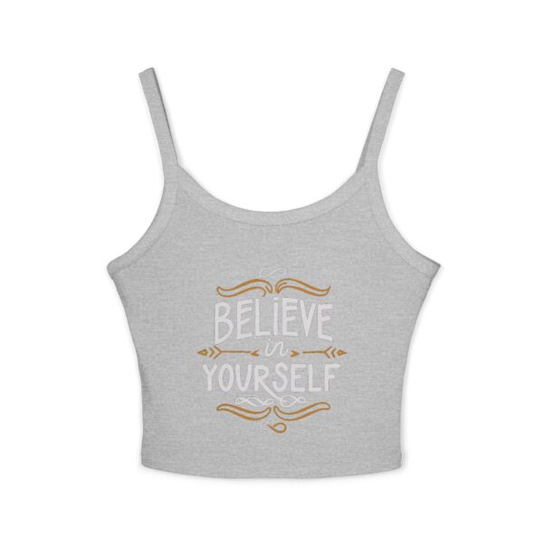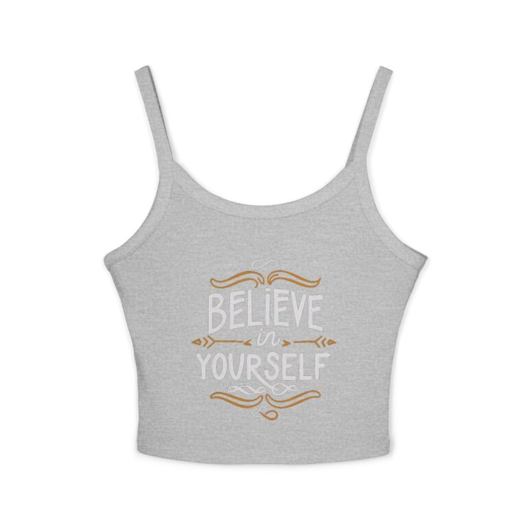 Elevate your wardrobe with this stylish and comfortable Women’s Spaghetti Strap Tank Top. Perfect for layering or wearing solo, this tank top radiates positivity with its inspiring message, “Believe in Yourself.” Crafted from a blend of soft Airlume combed cotton and polyester, it provides a luxurious feel against your skin. Ideal for casual outings, yoga sessions, or lounging at home, this tank top not only offers comfort but also empowers your spirit.