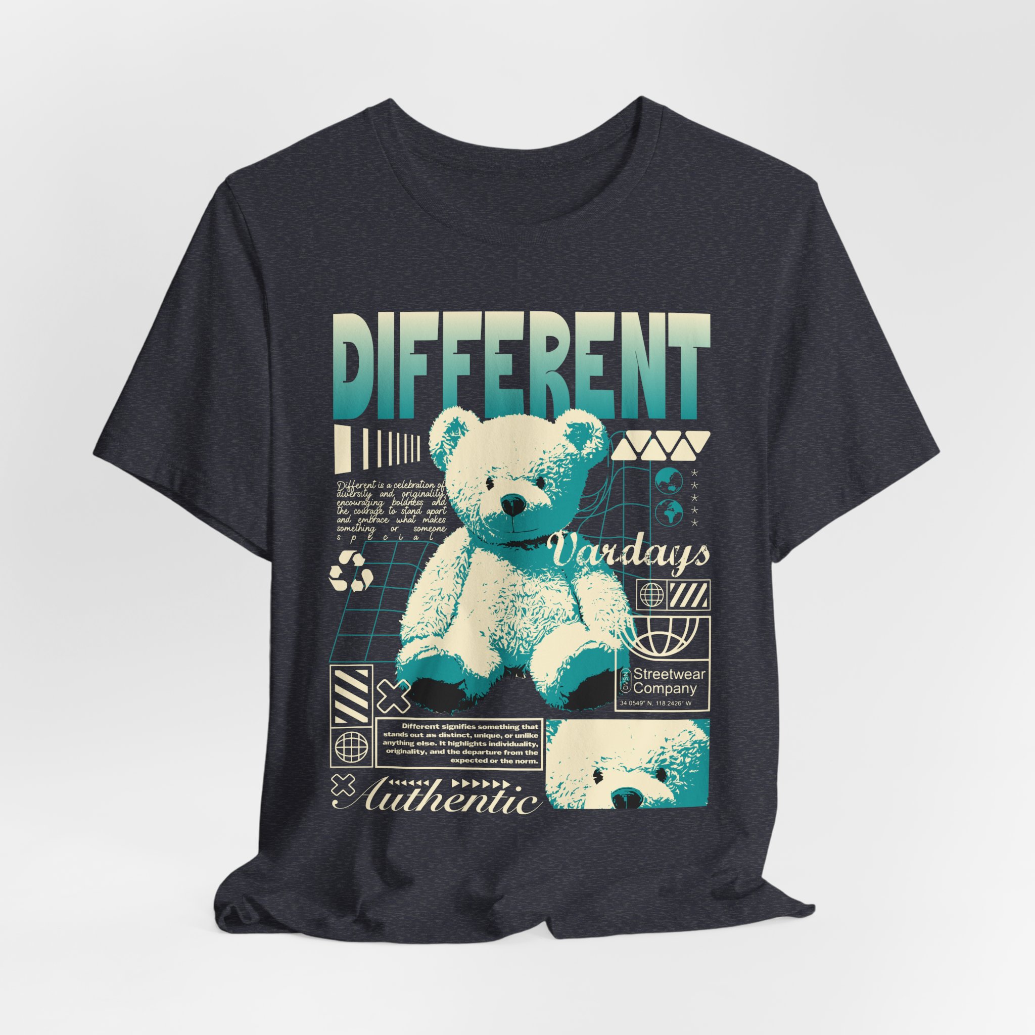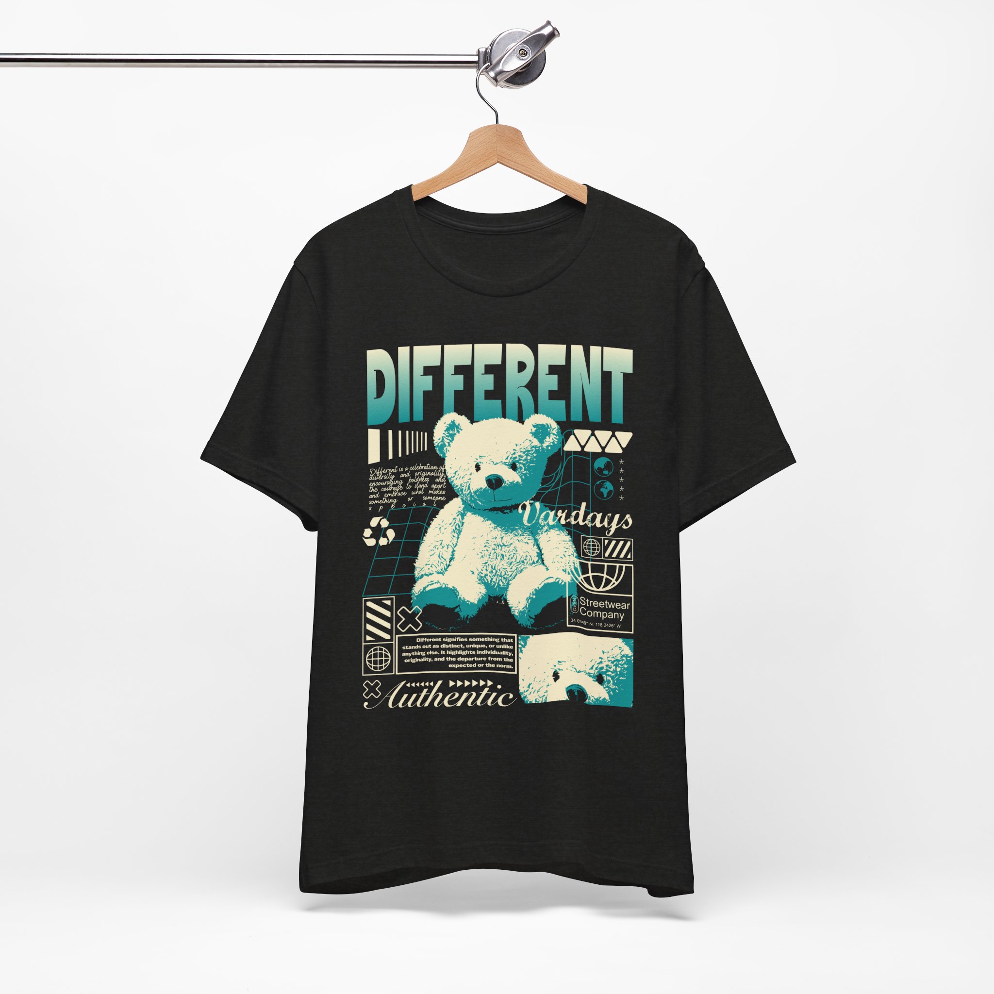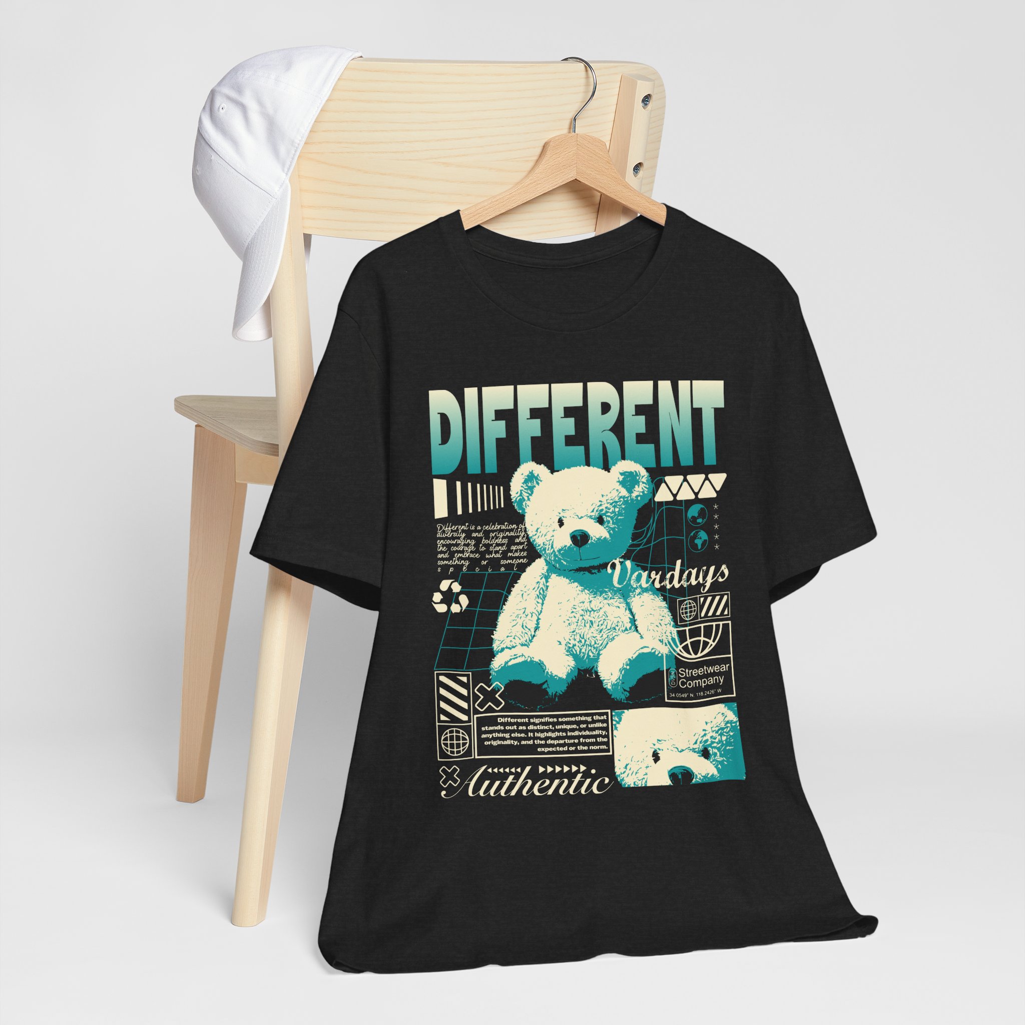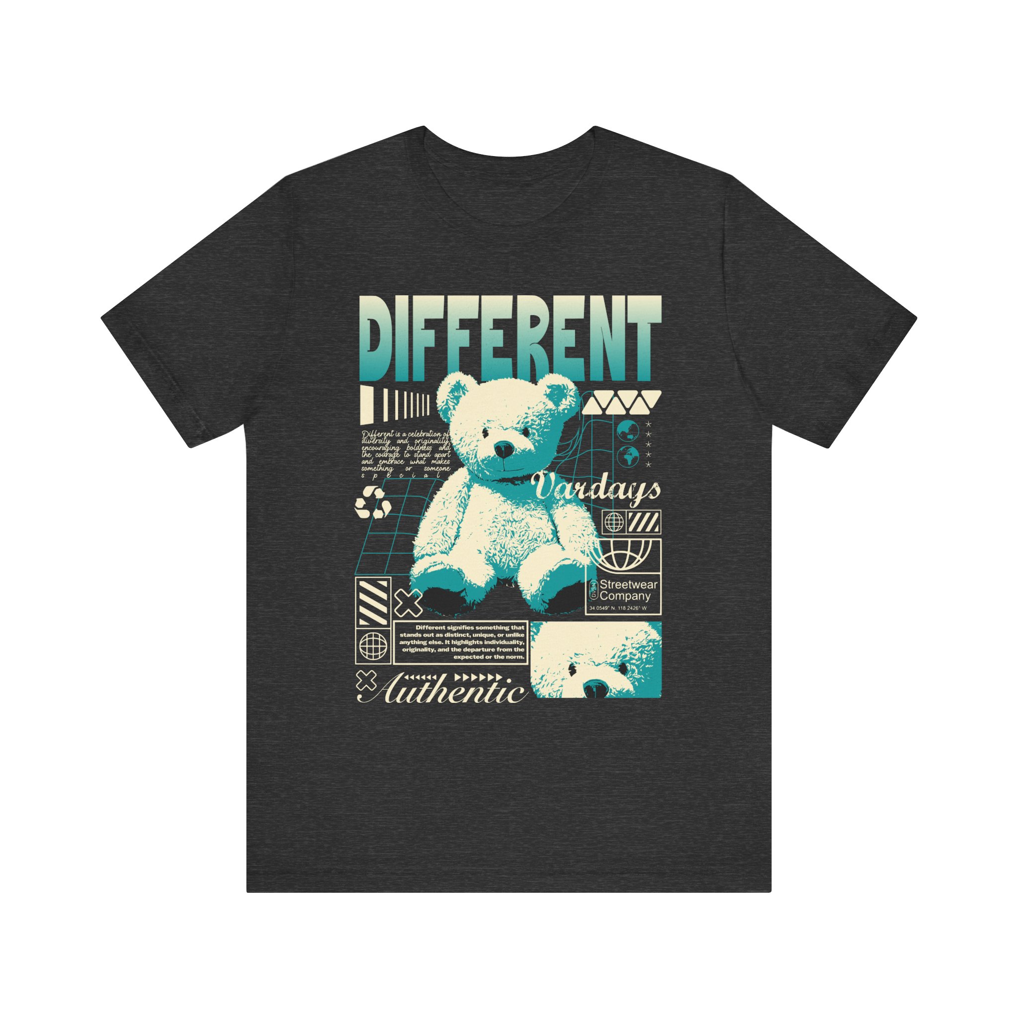 A trendy streetwear tee with the text ‘Different’ printed on it, giving off a cool and edgy vibe. Perfect for those who want to express their individuality and stand out from the crowd. Ideal for casual wear, street style, and everyday outfits. Relevant for events like casual Fridays, weekends, and social gatherings.