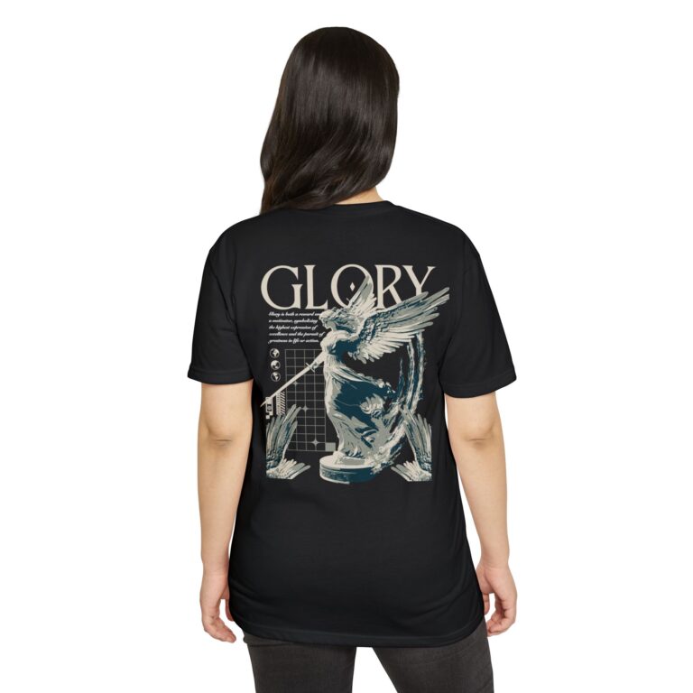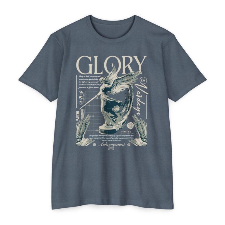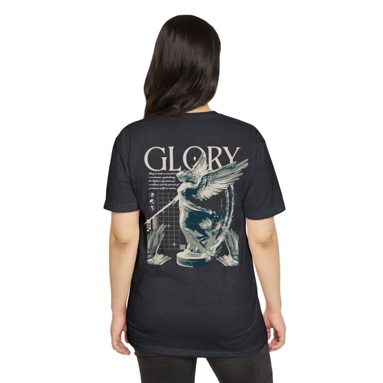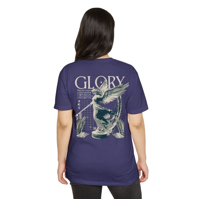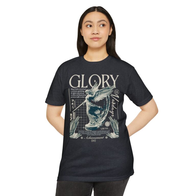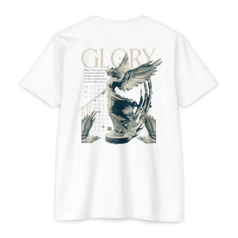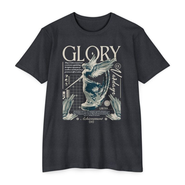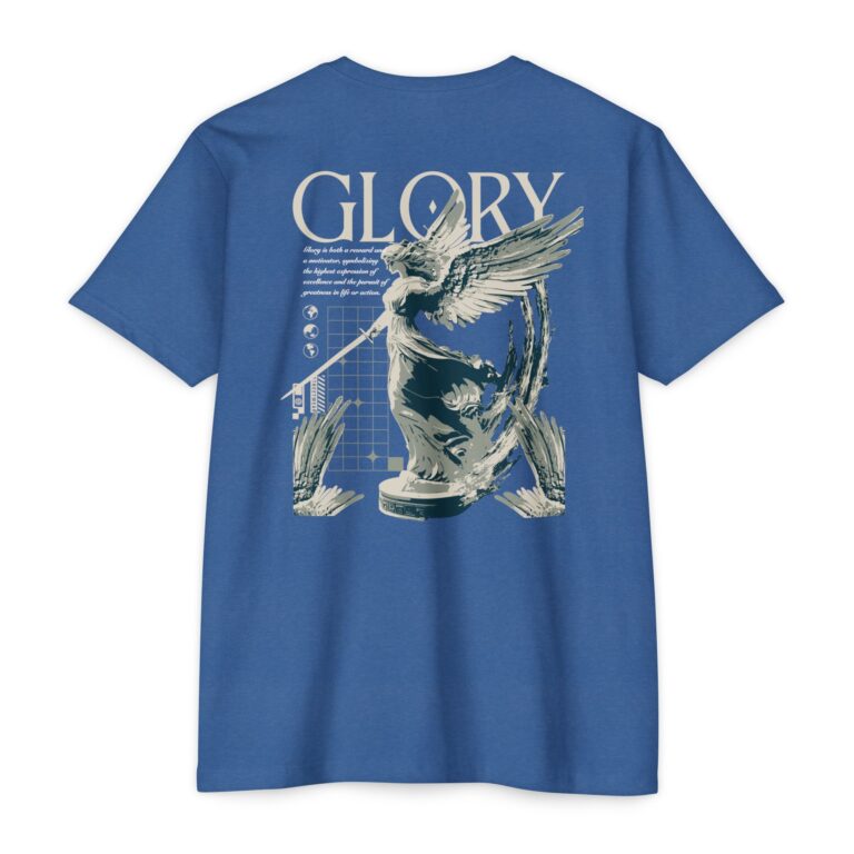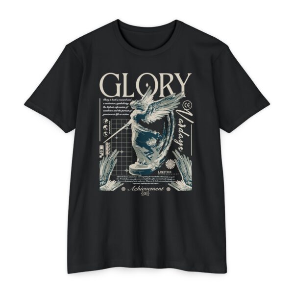 A street style streetwear T-shirt with the text Glory and a stylized image of an archangel with a sword in hand. This edgy design gives off a cool urban vibe and is perfect for those who appreciate unique and bold fashion statements. Ideal for fans of streetwear culture and those who enjoy showcasing their personal style. Relevant for occasions like concerts, festivals, and casual outings.