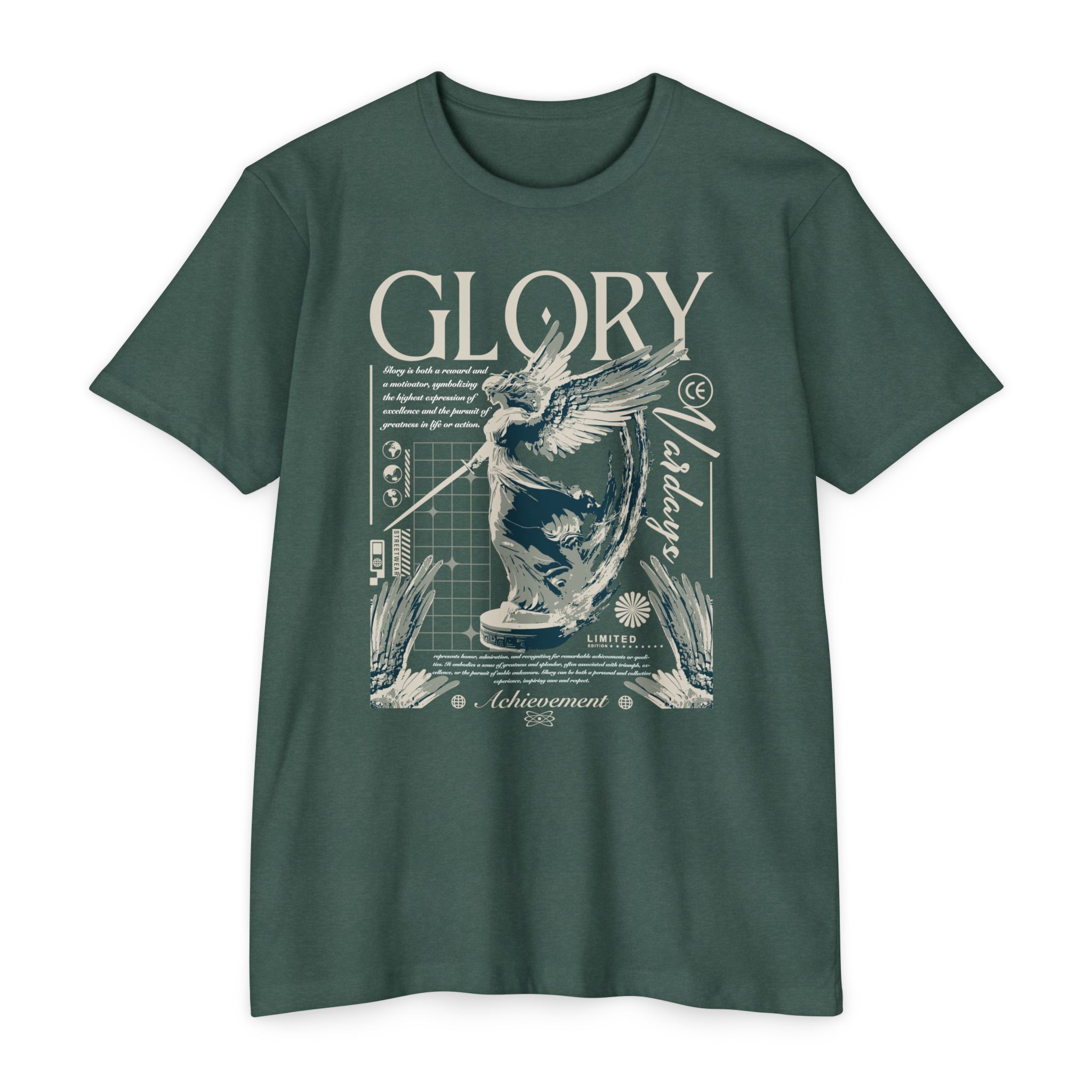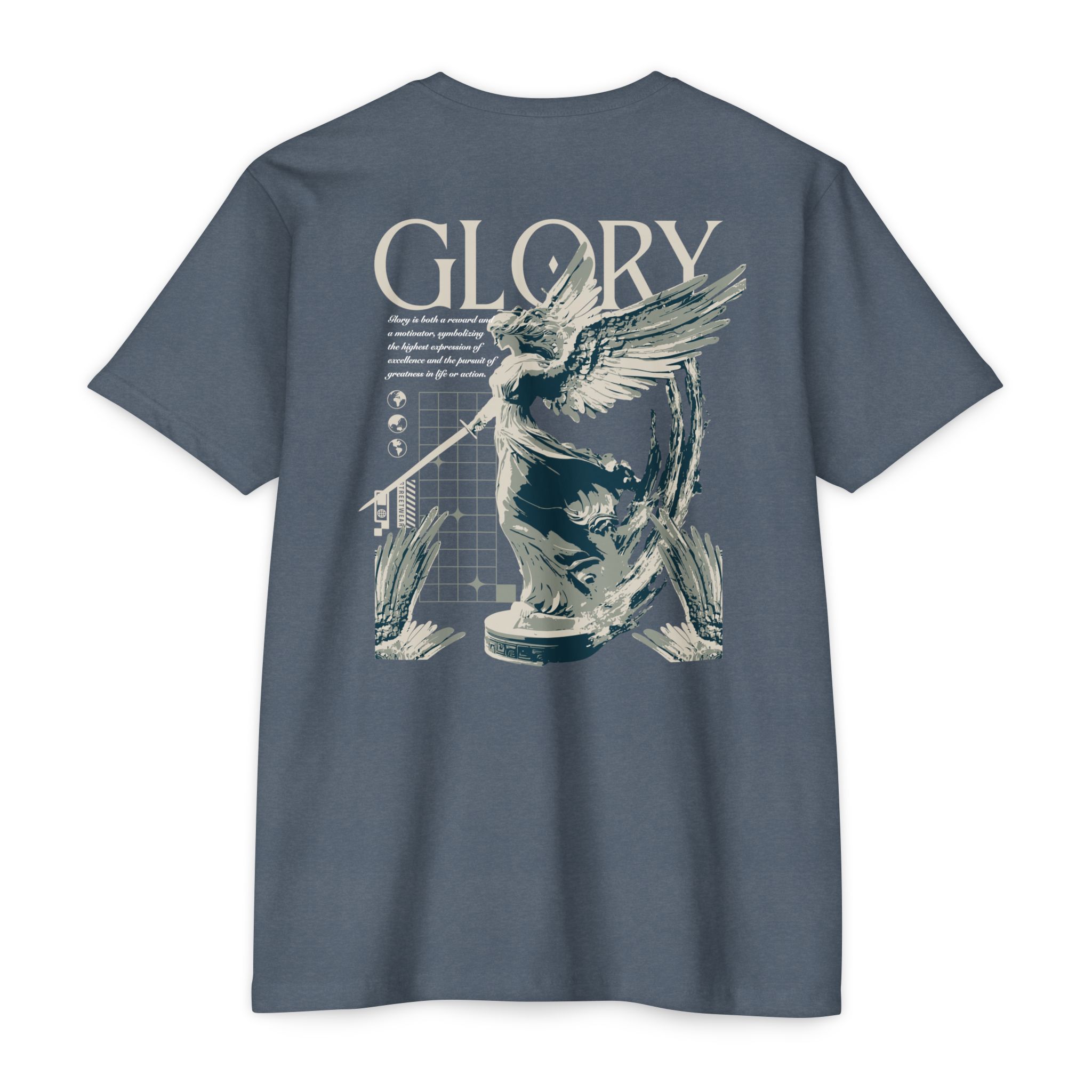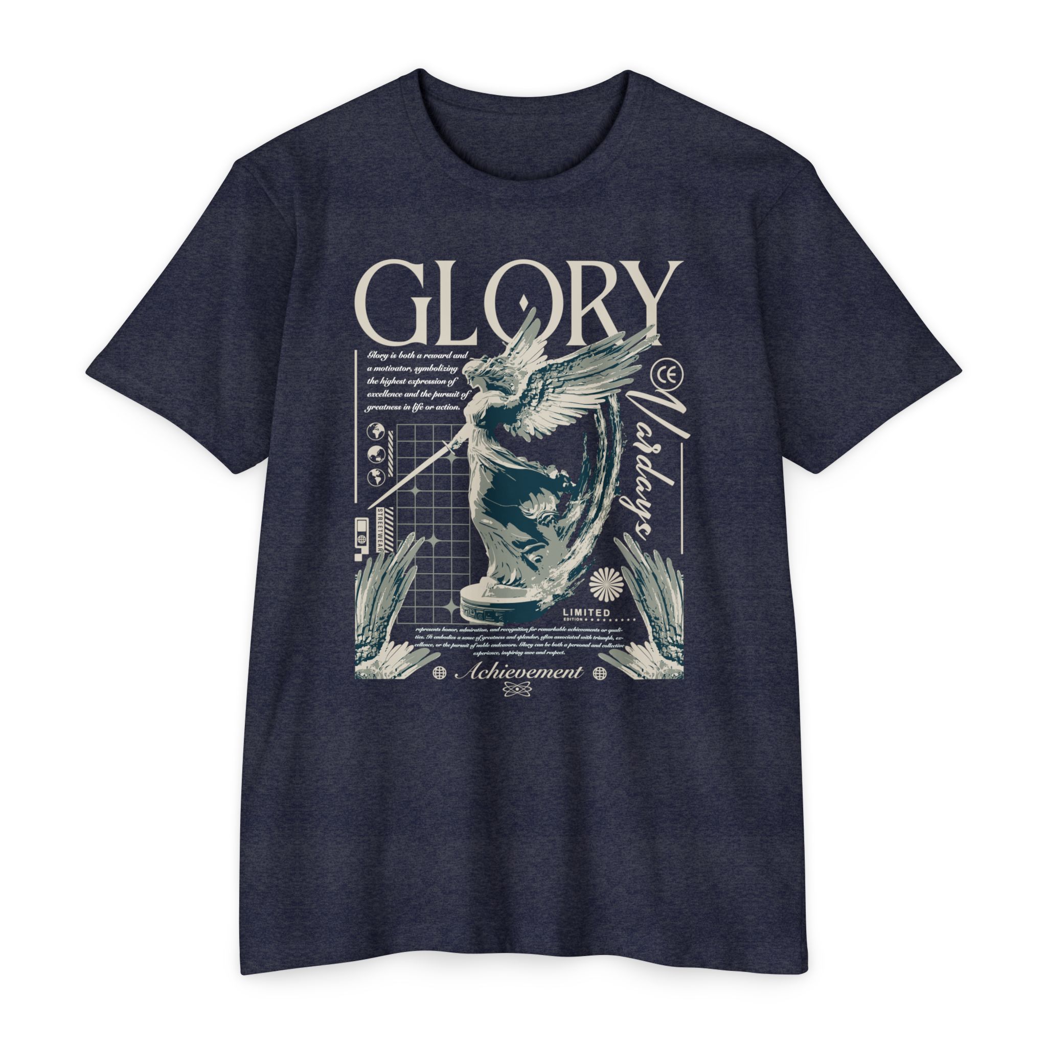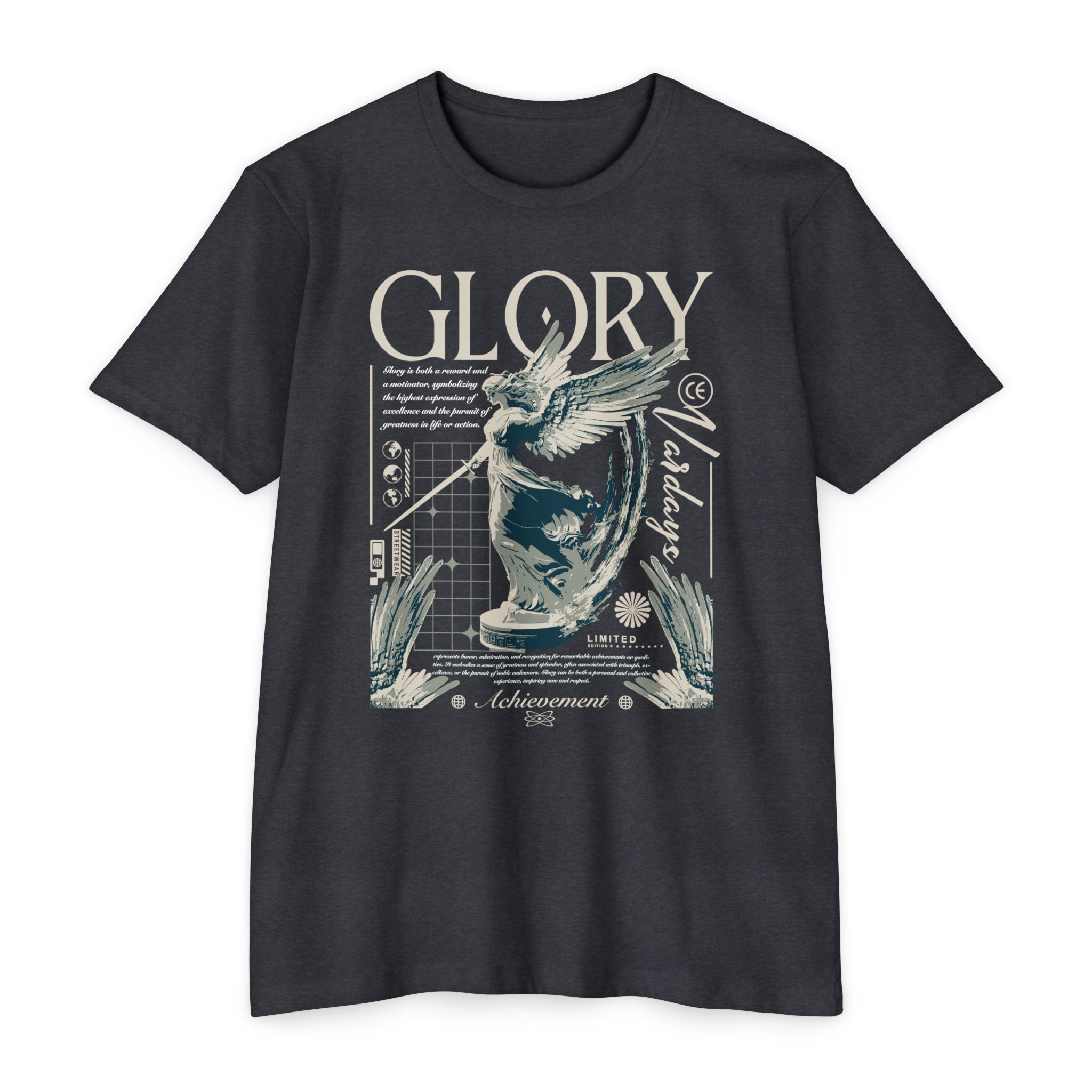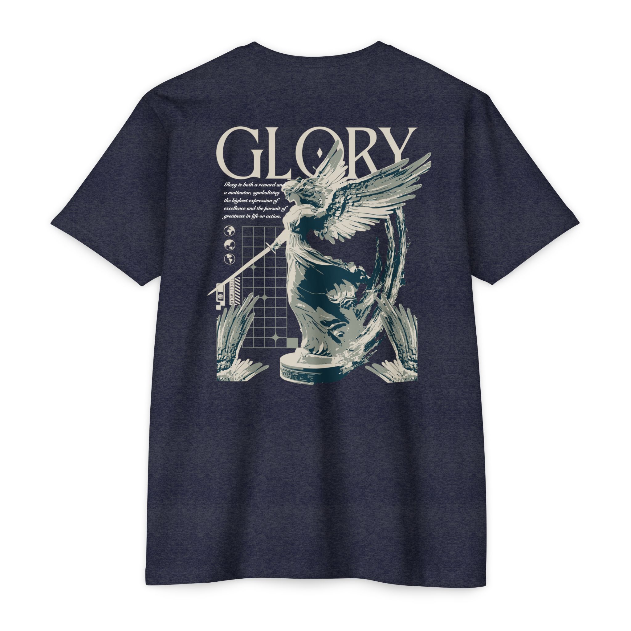 A street style streetwear T-shirt with the text Glory and a stylized image of an archangel with a sword in hand. This edgy design gives off a cool urban vibe and is perfect for those who appreciate unique and bold fashion statements. Ideal for fans of streetwear culture and those who enjoy showcasing their personal style. Relevant for occasions like concerts, festivals, and casual outings.