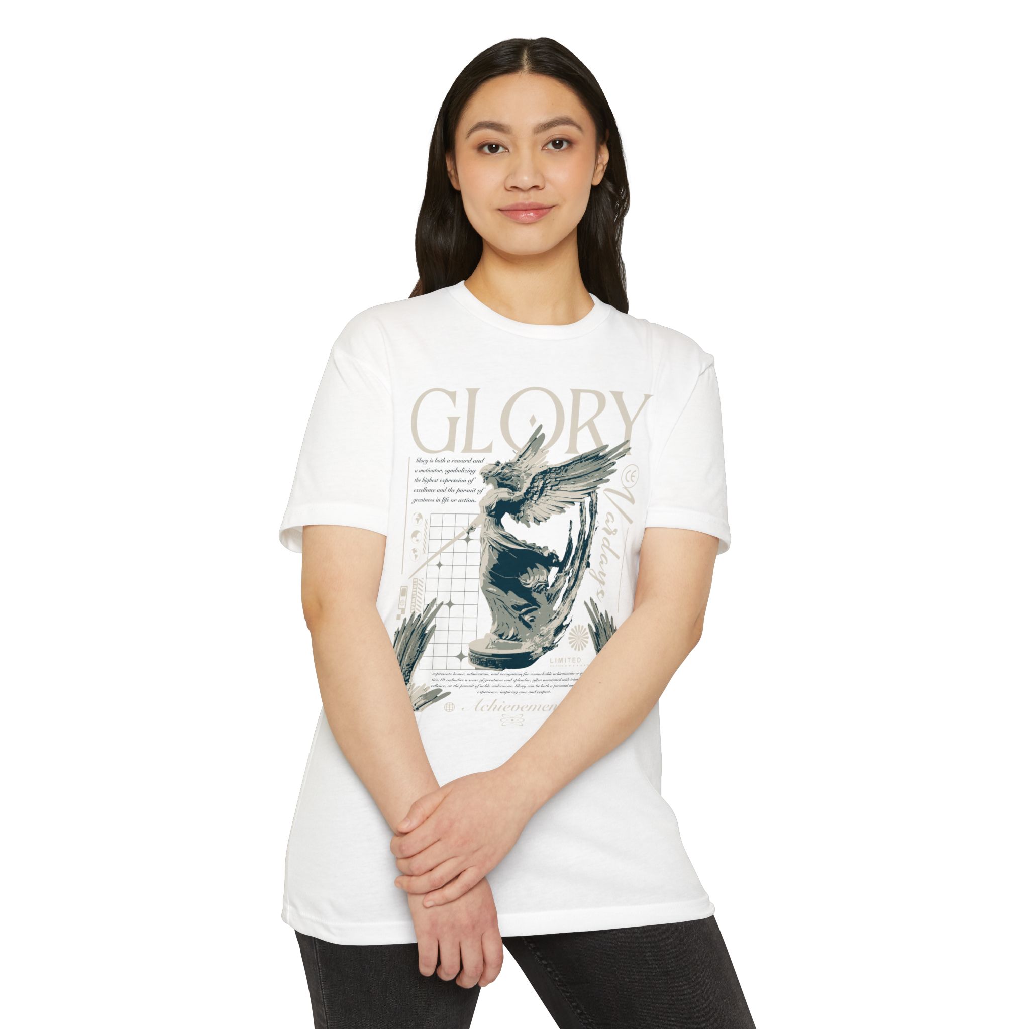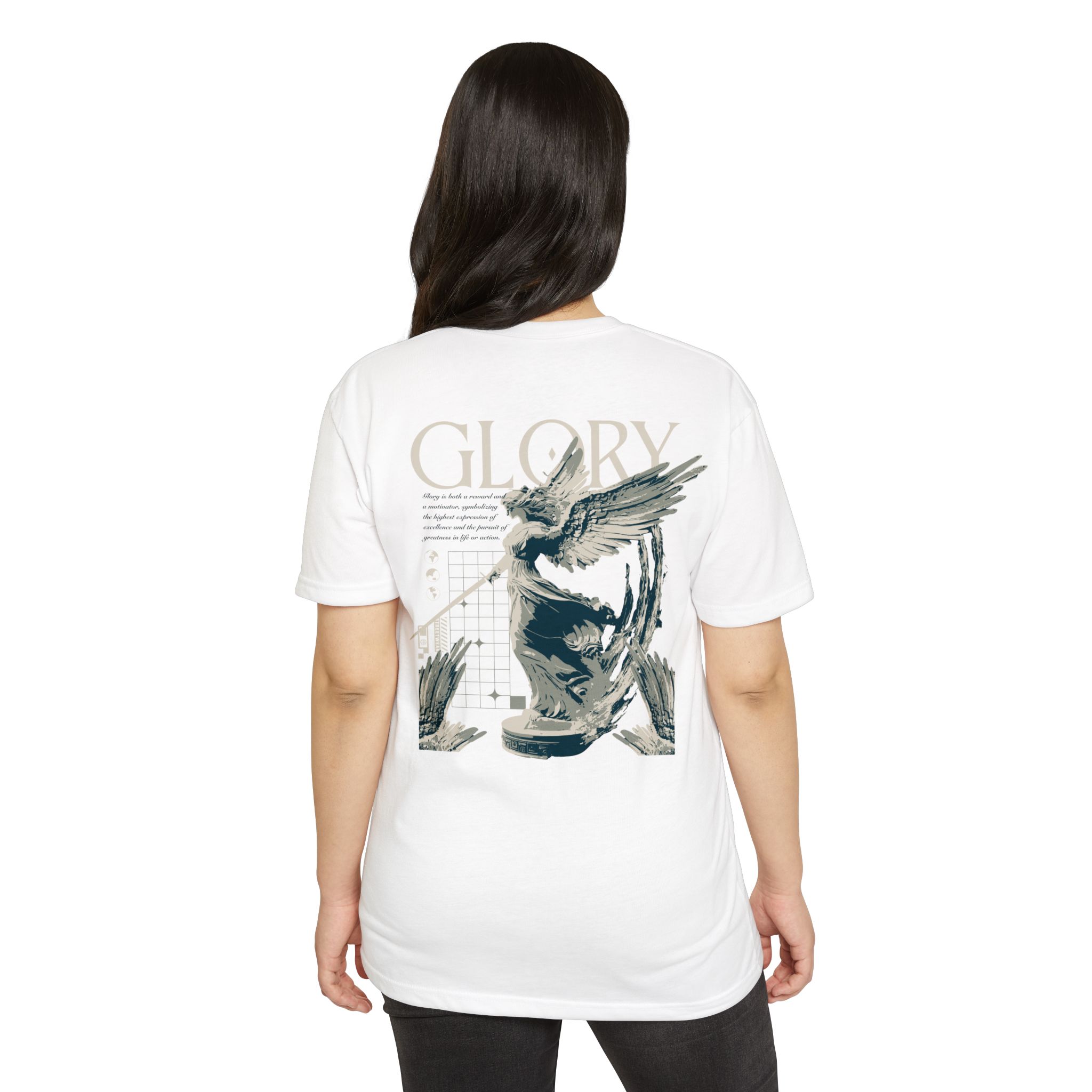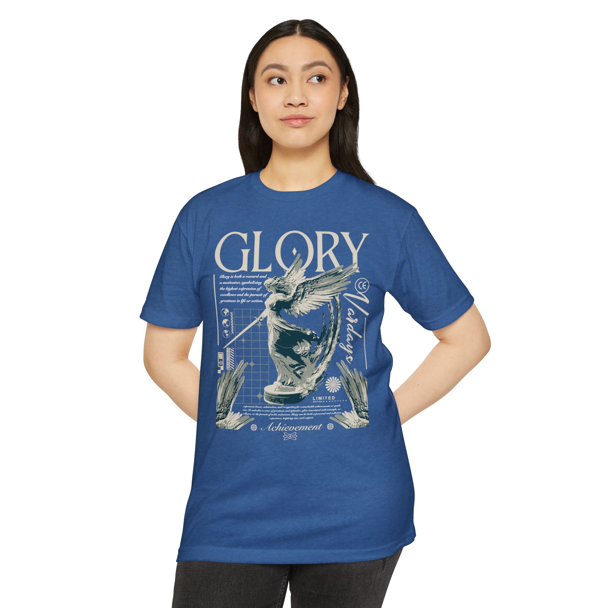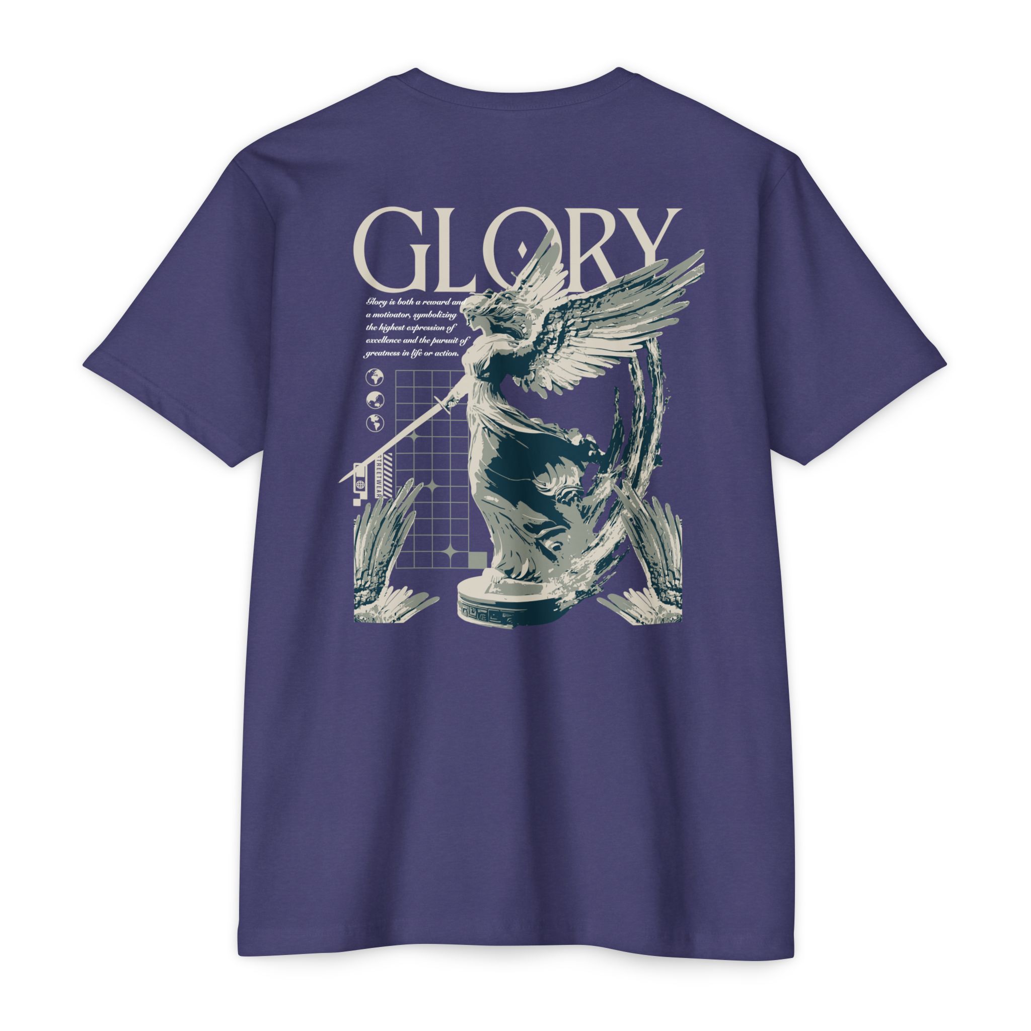 A street style streetwear T-shirt with the text Glory and a stylized image of an archangel with a sword in hand. This edgy design gives off a cool urban vibe and is perfect for those who appreciate unique and bold fashion statements. Ideal for fans of streetwear culture and those who enjoy showcasing their personal style. Relevant for occasions like concerts, festivals, and casual outings.