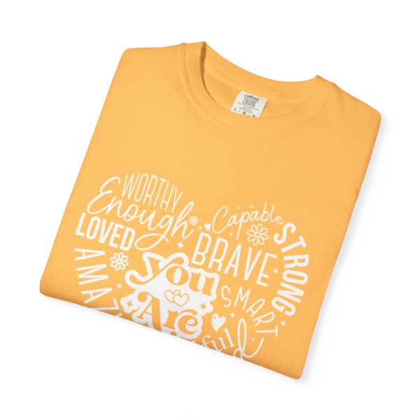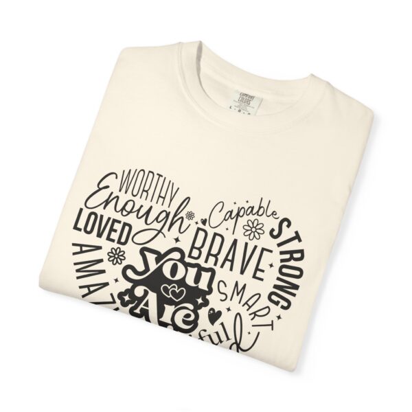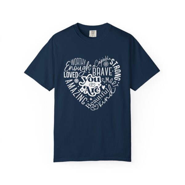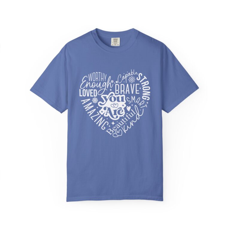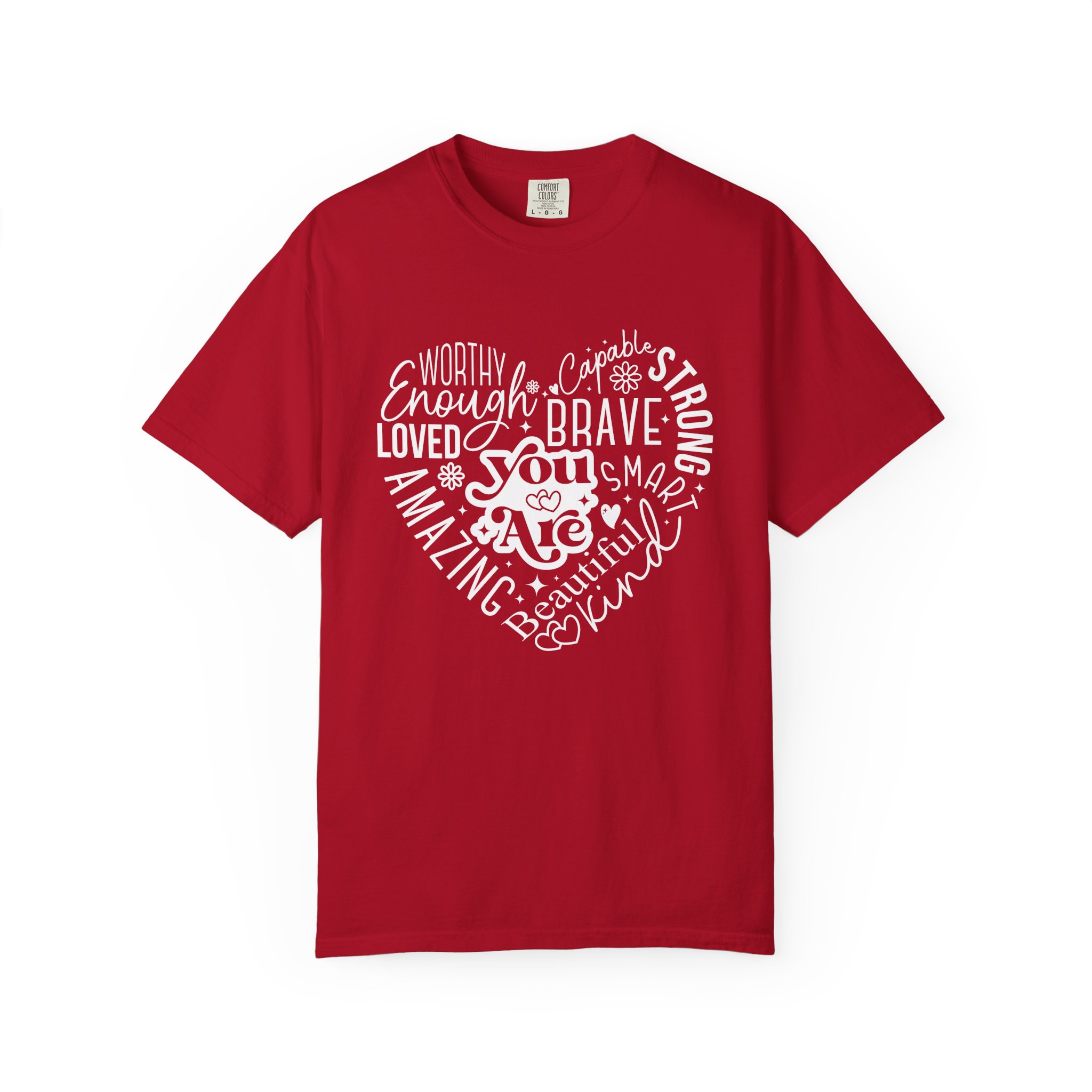 Our “You Are Loved” Heart Graphic Tee brings encouragement and strength to your everyday style. Featuring a heart-shaped word art design filled with uplifting affirmations, this tee is crafted for comfort, durability, and positive energy. Made from 100% ring-spun US cotton, this tee feels soft against your skin and is perfect for daily wear, outings, or casual gatherings. Its relaxed fit and classic crew neckline make it a versatile addition to your wardrobe, easily paired with jeans, shorts, or skirts. This T-shirt is ideal for adults looking to express themselves, whether for birthdays, casual get-togethers, or simply as a fun, everyday statement piece.