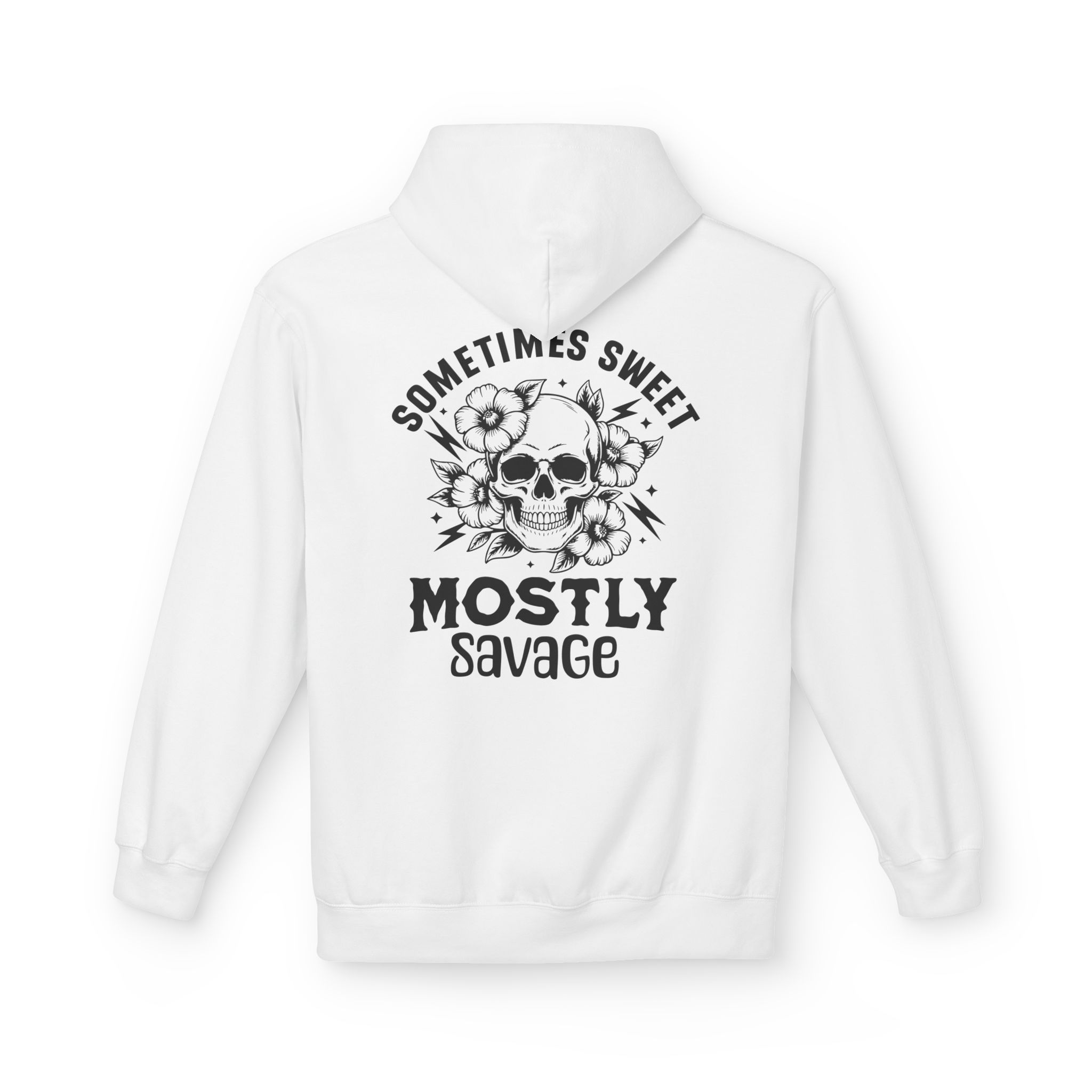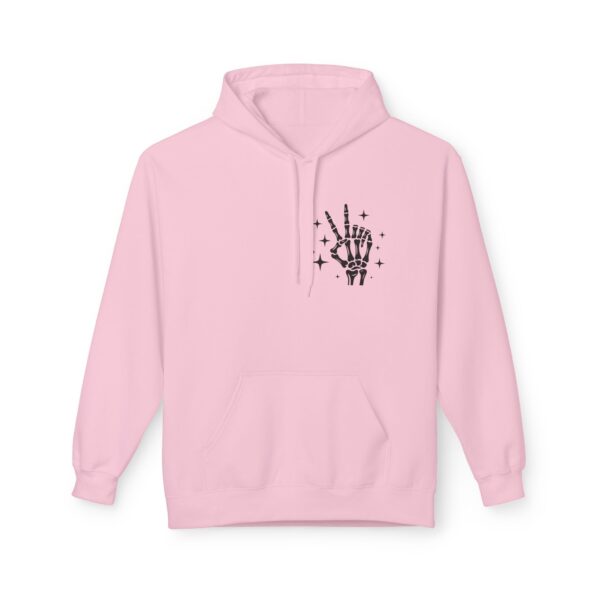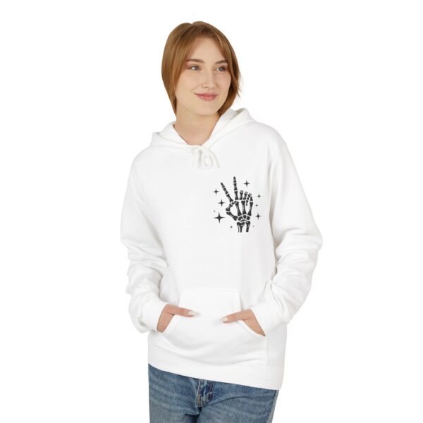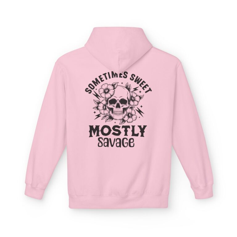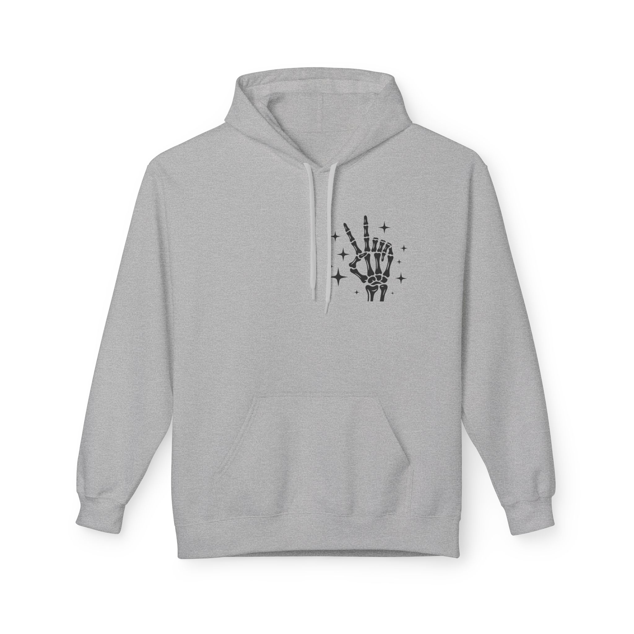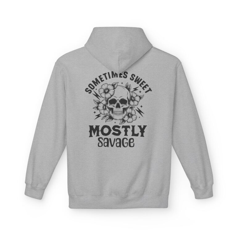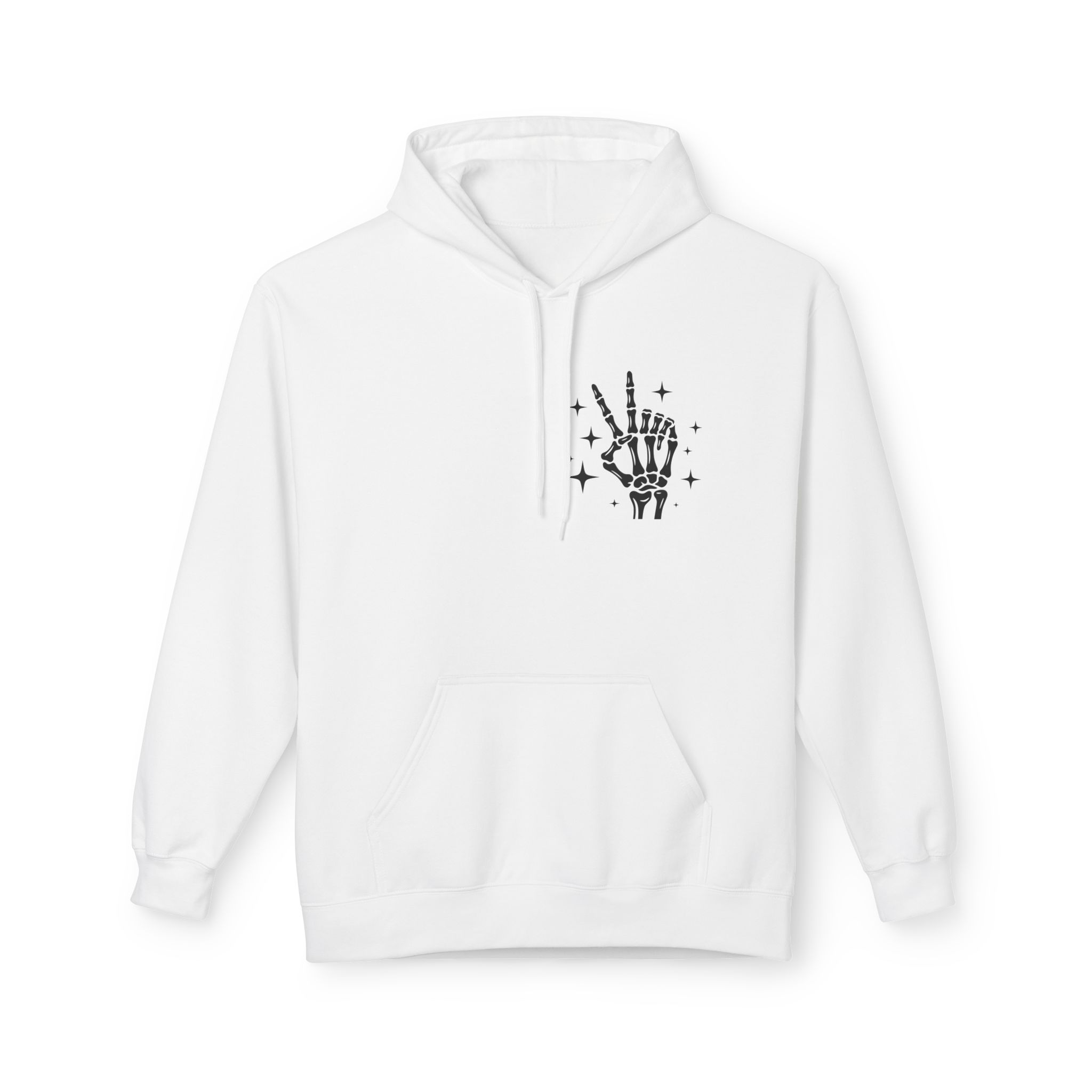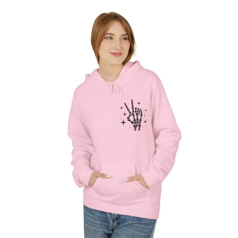 This midweight hoodie carries a quietly bold attitude — soft, roomy, and inked with hand-drawn skull and skeletal motifs that balance sweet florals with a savage wink. Wear it on cool mornings for slow coffee runs, at late-night bonfires, or layered under a jacket for a concert. The relaxed drop-shoulder silhouette and pouch pocket make it feel lived-in from the first wear, while the sturdy fabric and thoughtful construction keep it ready for repeat rotation. It speaks to someone who likes contrast: gentle details and a sharp sense of humor, comfort and edge living in the same sleeve.