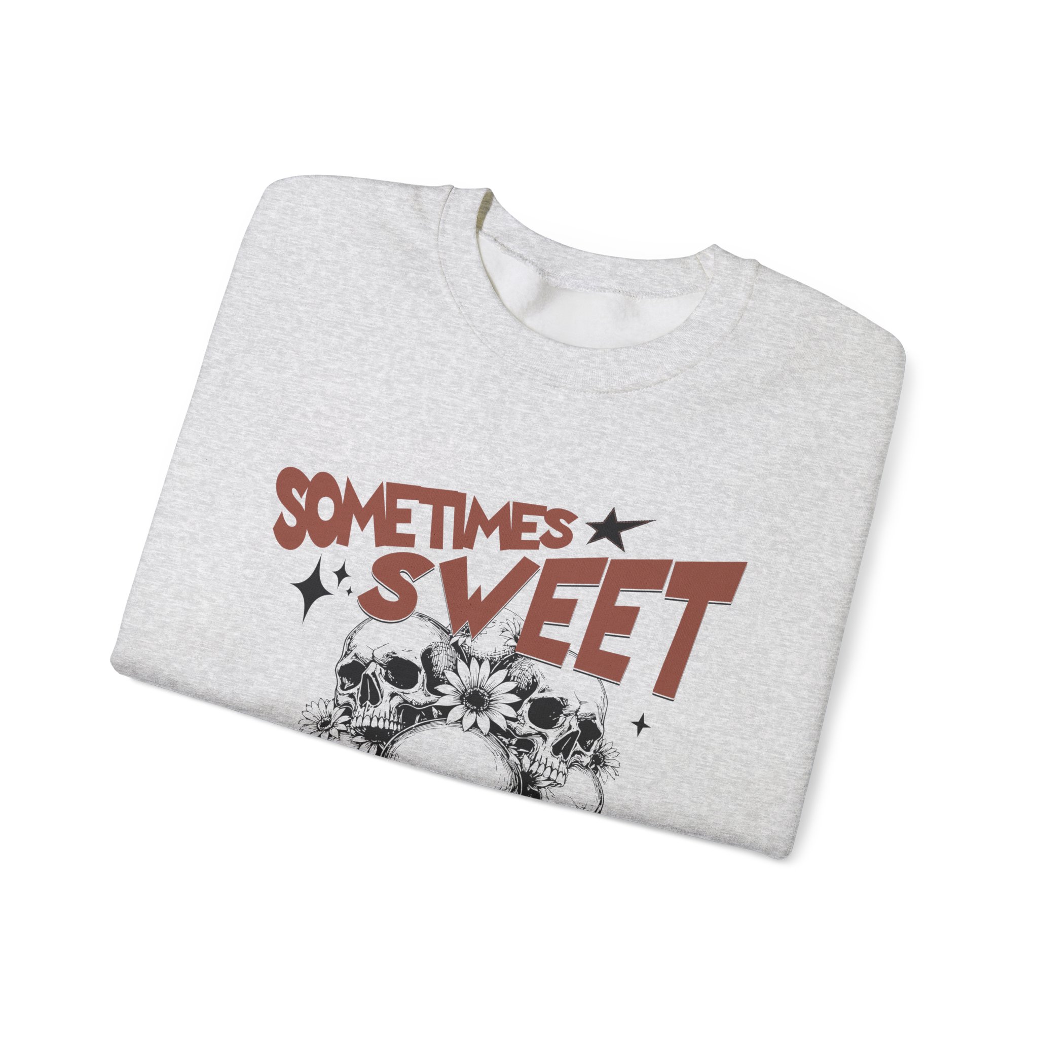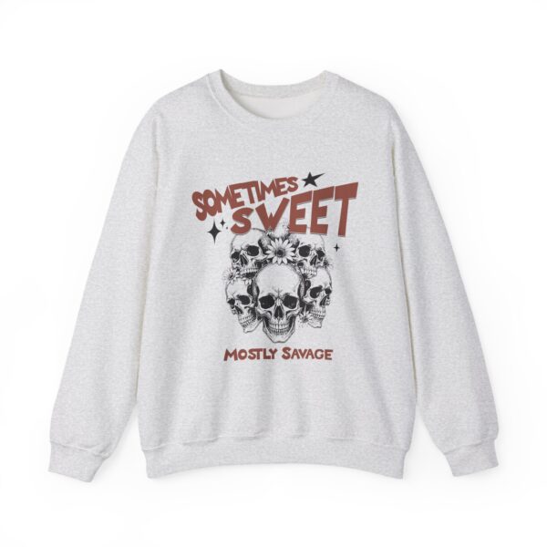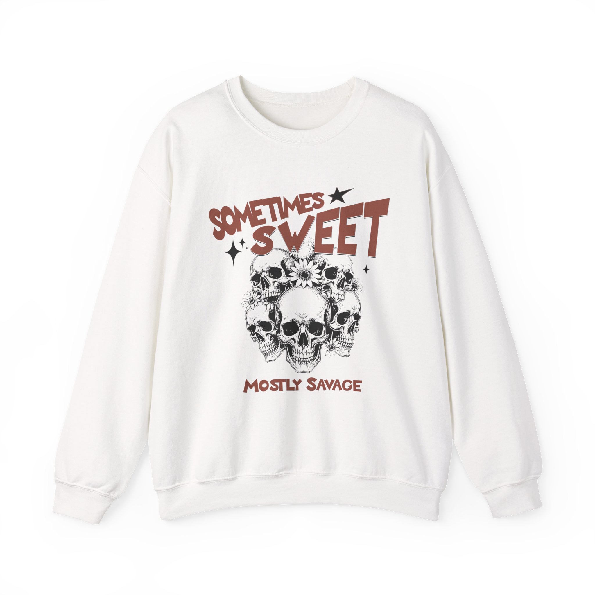 Soft, roomy, and a little rebellious — this crewneck blends cozy everyday wear with a bold, vintage-inspired graphic. The front features a floral skull trio with retro lettering that reads “Sometimes Sweet” and “Mostly Savage,” giving the sweatshirt a playful, darkly charming vibe. Made from a sturdy 50/50 cotton-poly blend with double-needle stitching and a ribbed collar, it feels durable without being stiff. Wear it on crisp mornings, at low-key concerts, or when you want to pair comfort with an attitude. The neutral base lets the inked design stand out while keeping your look understated and easy to layer.